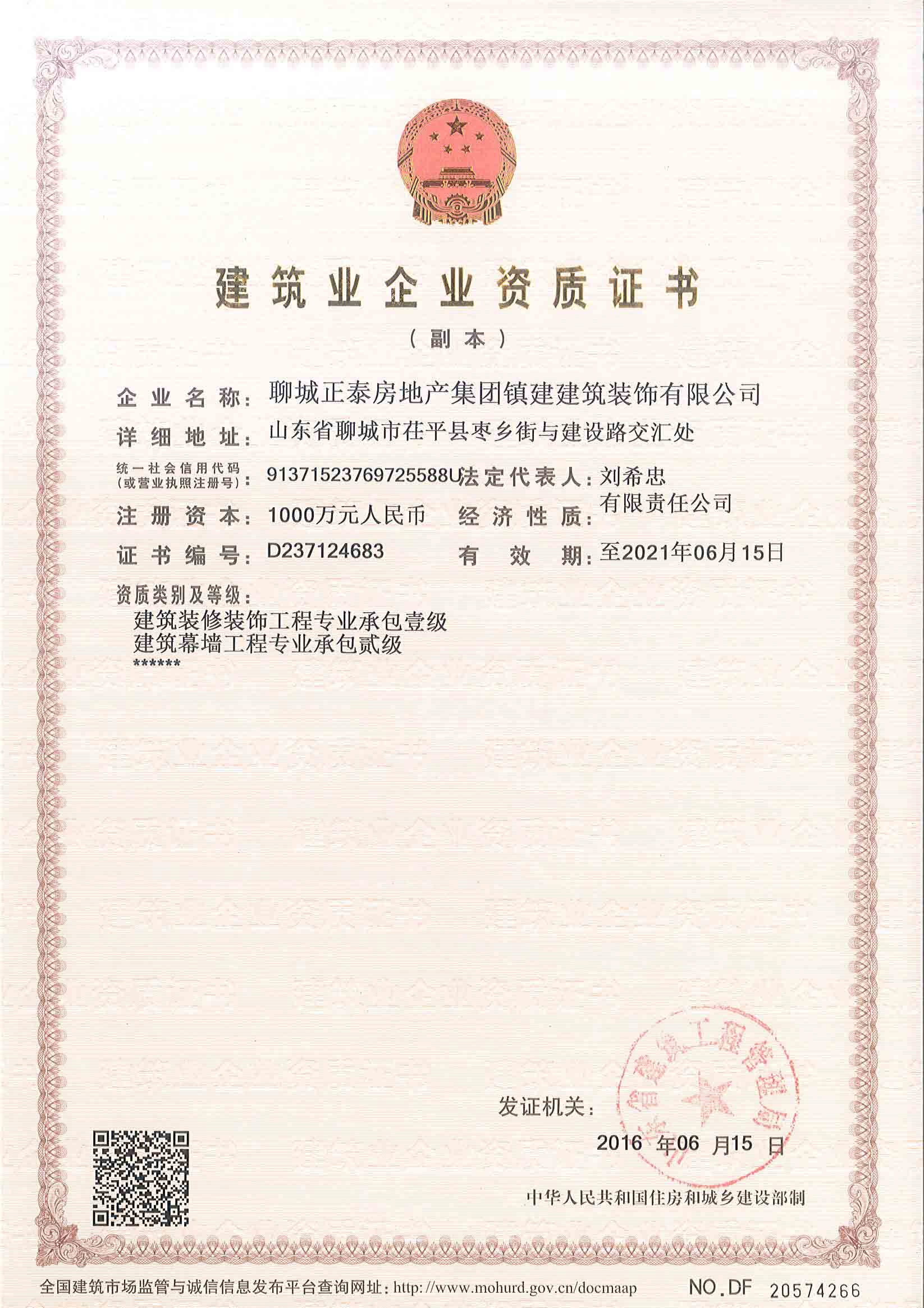 国家建筑装修装饰工程专业承包壹级