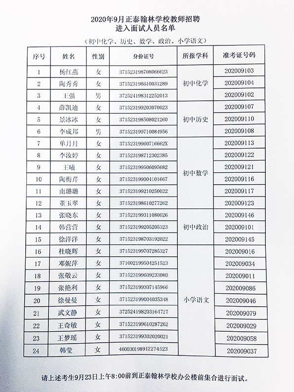 2020年9月红足666814旧版翰林学校教师招聘进入面试人员名单