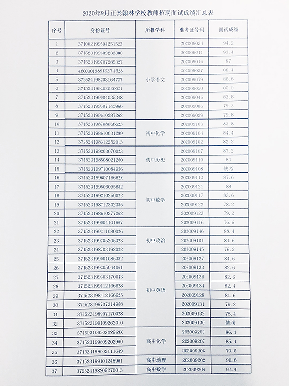 2020年9月红足666814旧版翰林学校教师招聘面试成绩汇总表