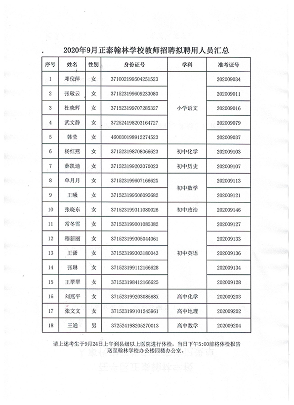 2020年9月红足666814旧版翰林学校教师招聘拟聘用人员汇总表