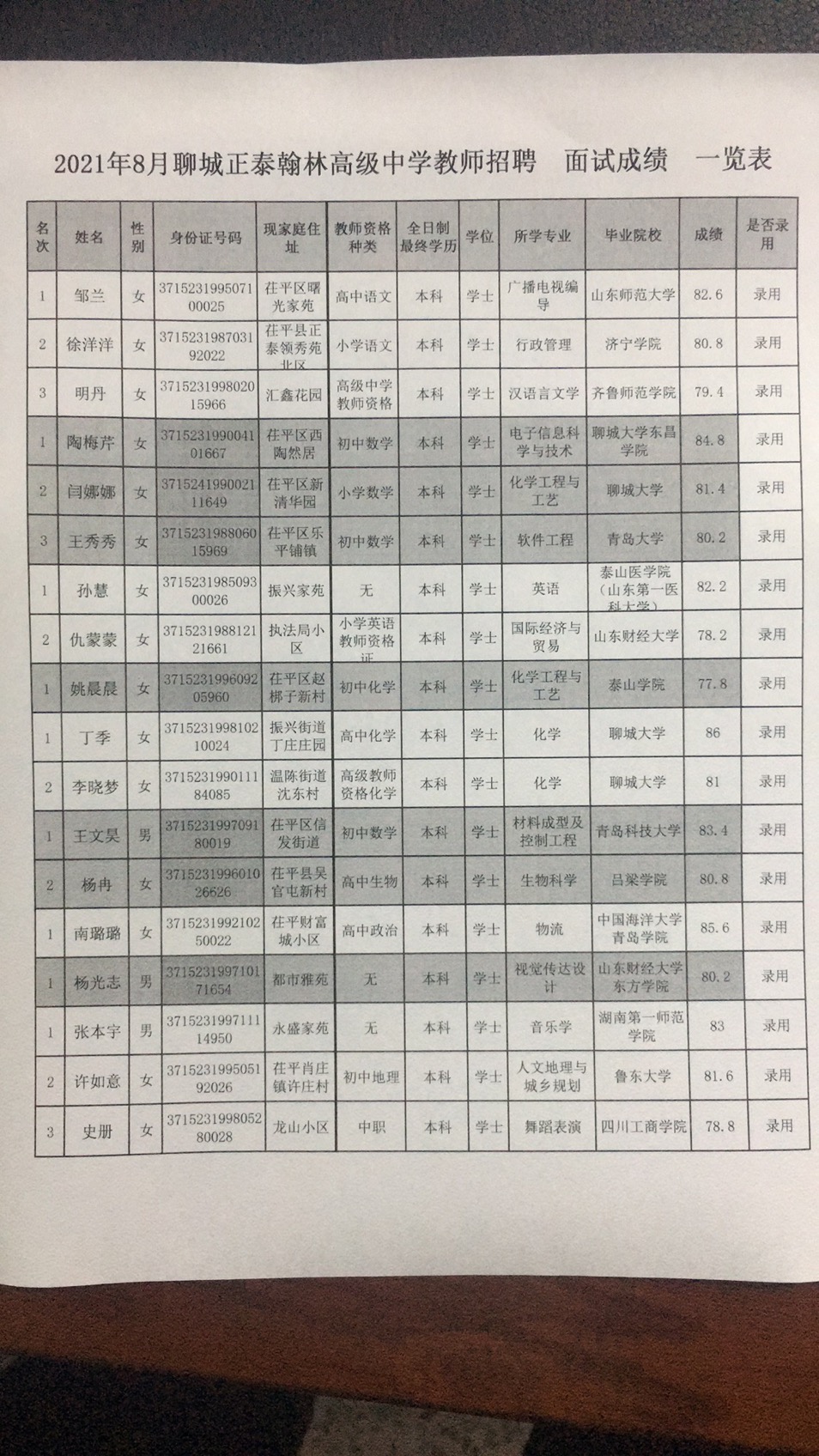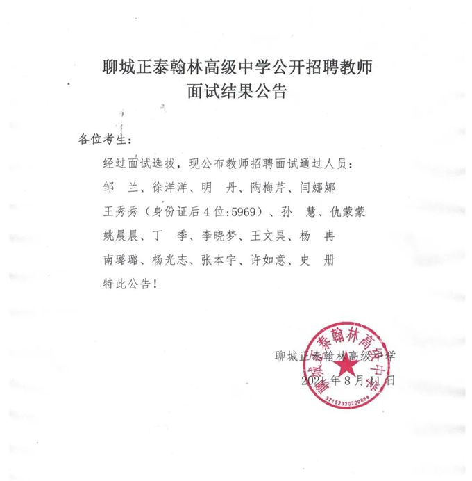 聊城红足666814旧版翰林高级中学教师招聘面试录用人员名单